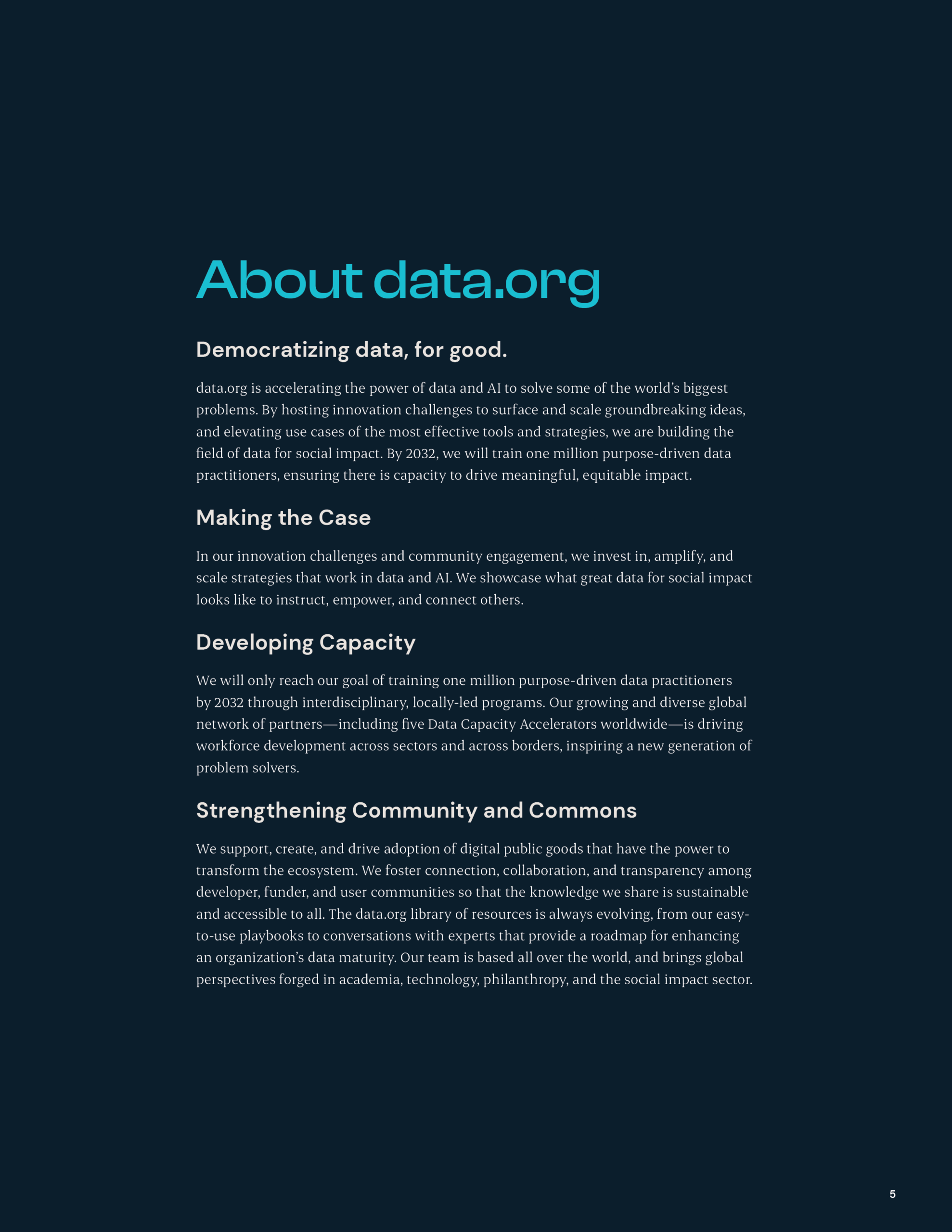 At data.org, reports are more than static documents—they are designed as tools for action. Each publication blends research, storytelling, and design to make complex insights on data and AI accessible to diverse audiences, from policymakers to practitioners on the ground. Whether showcasing global initiatives, elevating the voices of partners, or mapping out roadmaps for innovation, these reports serve as both thought leadership and practical guides. The design approach emphasizes clarity, visual storytelling, and cohesion with the organization’s brand, ensuring that every report not only informs but also inspires engagement and impact.